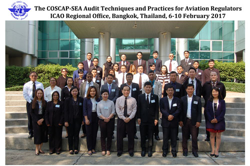 ICAO COSCAP SEA - AUDITING TECHNIQUES AND PRACTICES FOR AVIATION REGULATORS (6-10 FEBRUARY 2017, BANGKOK, THAILAND) ICAO COSCAP-SEA project and Civil Aviation Authority of Singapore presented the 2017 Training Programme for Government Safety Inspectors with four courses in the initial phase of the training programme. The first course "Auditing Techniques and Practices for Aviation Regulators" was held at the ICAO APAC Regional Office in Bangkok, Thailand from 6 to 10 February 2017. The course was attended by 42 participants from 9 States/ Administrations. The training covered the foundation on the principles and procedures for the conducting safety audits on an aviation organization. The course was conducted by Mr. Allan Tang (Principal Training Specialist, Singapore Aviation Academy). All documents are available at: http://www.icao.int/APAC/Meetings/Pages/2017-AT-PAR.aspx