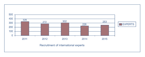In 2015, 253 international field experts and consultants were recruited by ICAO. Together with 871 national project personnel, there were 1 124 serving officials, including 68 international field experts and consultants who were already serving in the field. These experts served as advisers to national civil aviation administrations, instructors at training centres or on the job, and, where States lacked the capabilities, as executive personnel providing governments with operational and administrative services, including safety inspections.